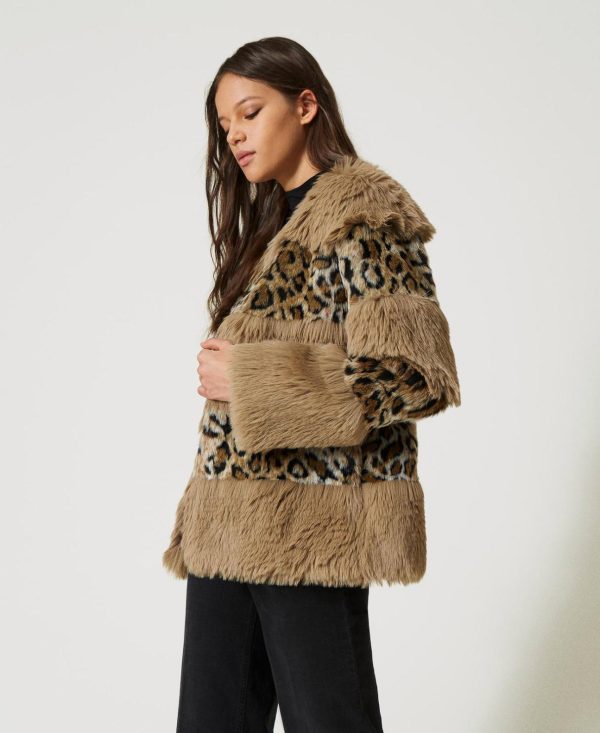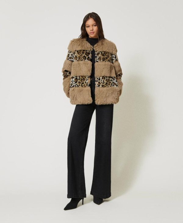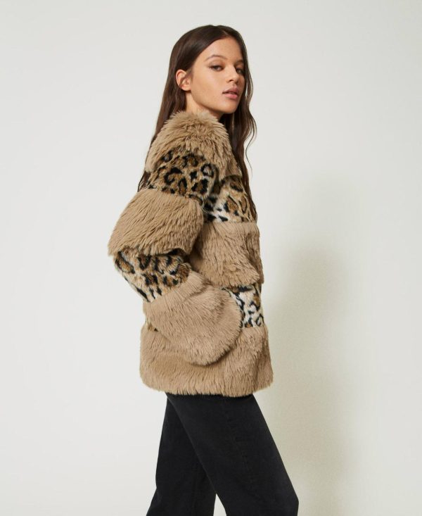 Twinset Milano Giacche E Piumini | Giacca In Faux Fur Con Righe Animalier Patch Animalier/Marrone “iced Coffee” Donna