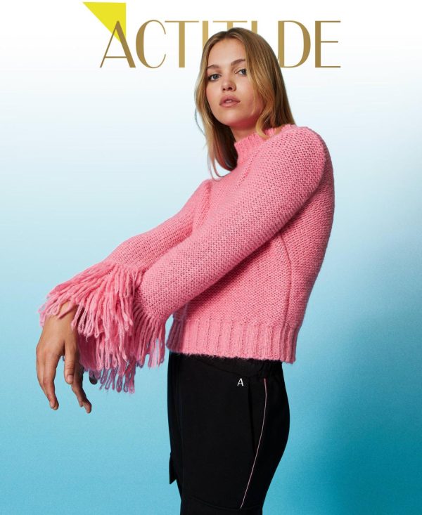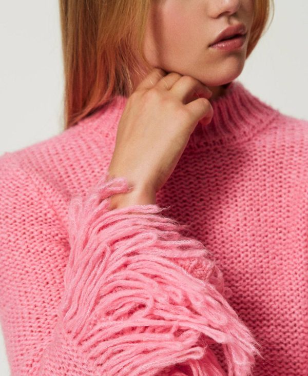 Maglia regular collezione Actitude in filato di misto lana e mohair con collo a cratere e frange applicate a mano.