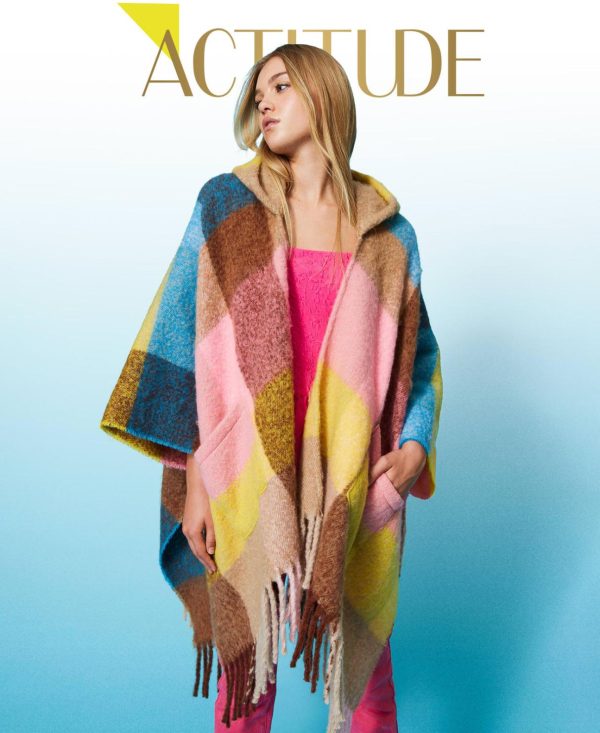 Poncho collezione Actitude in panno check con cappuccio, tasche applicate, fondi rifiniti con frange, placchetta logo.