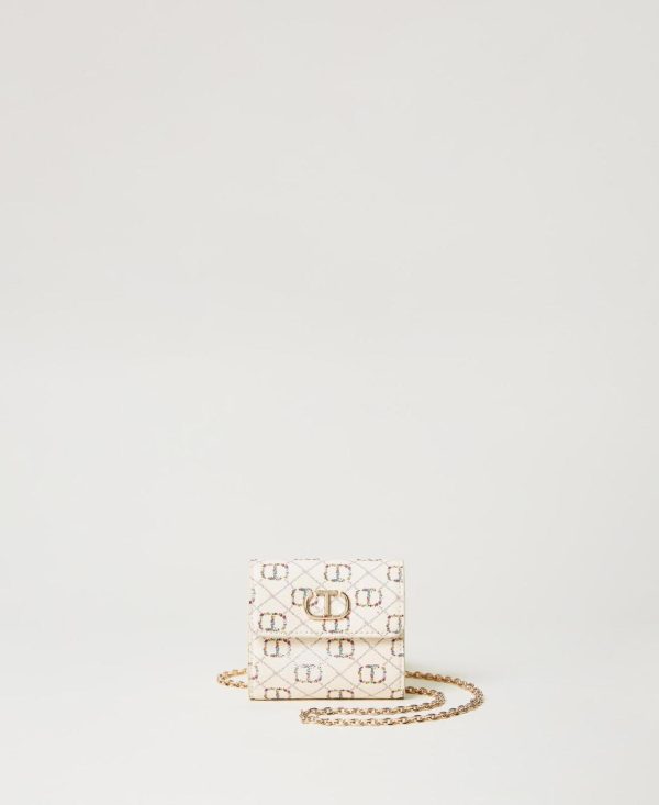 Portamonete effetto pelle a stampa saffiano con tracolla in catena, patta e bottone a pressione, logo Oval T in metallo.