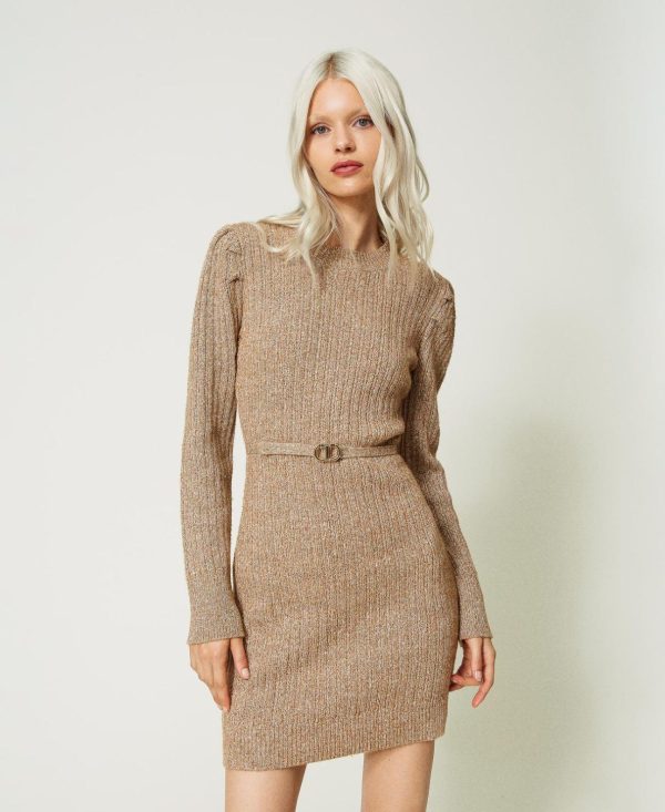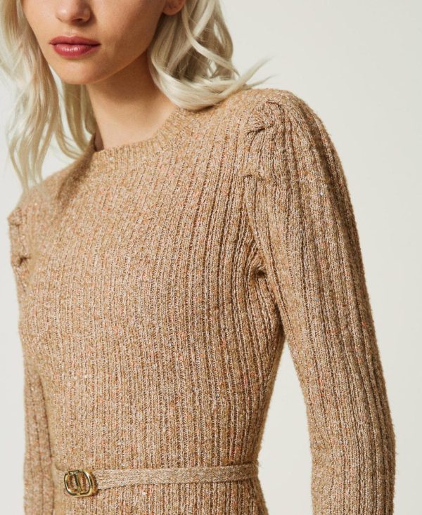Twinset Milano Vestiti Corti | Abito Corto A Coste Con Paillettes Pecan Brown Donna