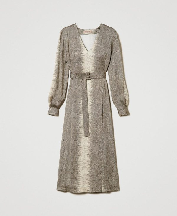 Abito lungo in raso di viscosa con stampa piazzata a disegno lizard in dégradé di colore, cintura abbinata con fibbia ricoperta.