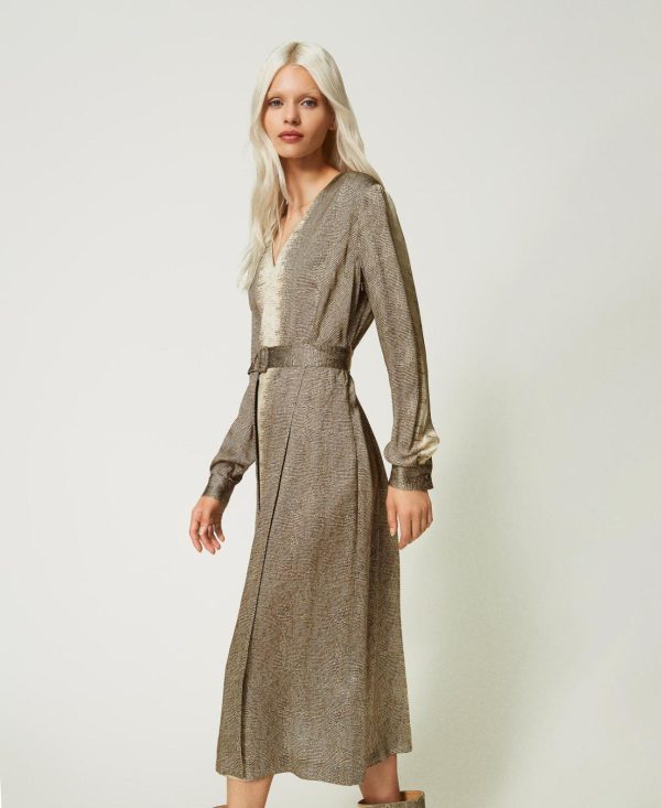 Per le tue occasioni speciali scegli l’abito lungo in raso di viscosa con stampa piazzata a disegno lizard in esclusiva per Twinset, nei toni naturali in dégradé di colore. Ha linea dritta, scollatura a V, maniche lunghe morbide con polsino e bottone gioiello, zip invisibile al fianco, placchetta logo Oval T sul retro. Lo puoi indossare con la cintura in coordinato con fibbia rettangolare ricoperta. Aggiungi tacchi alti e bijoux scenografici per completare lo stile.